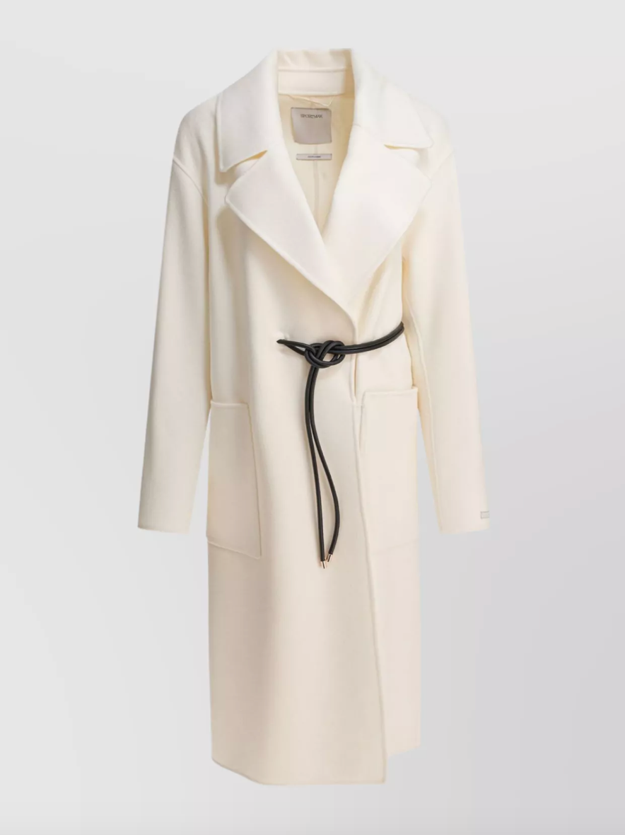 Long coat with a dressing gown construction, in a soft double wool The construction features an asymmetrical note on the right side, where the belt passes internally.