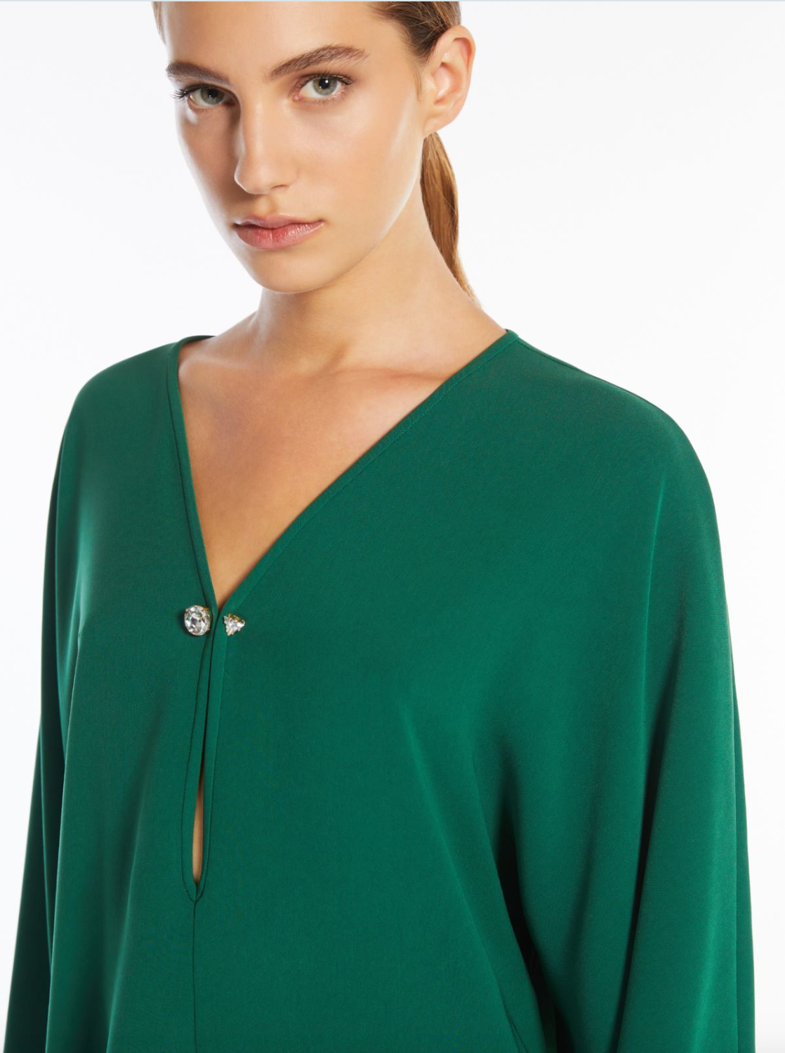 Raglan shoulders, crystal brooch fastening