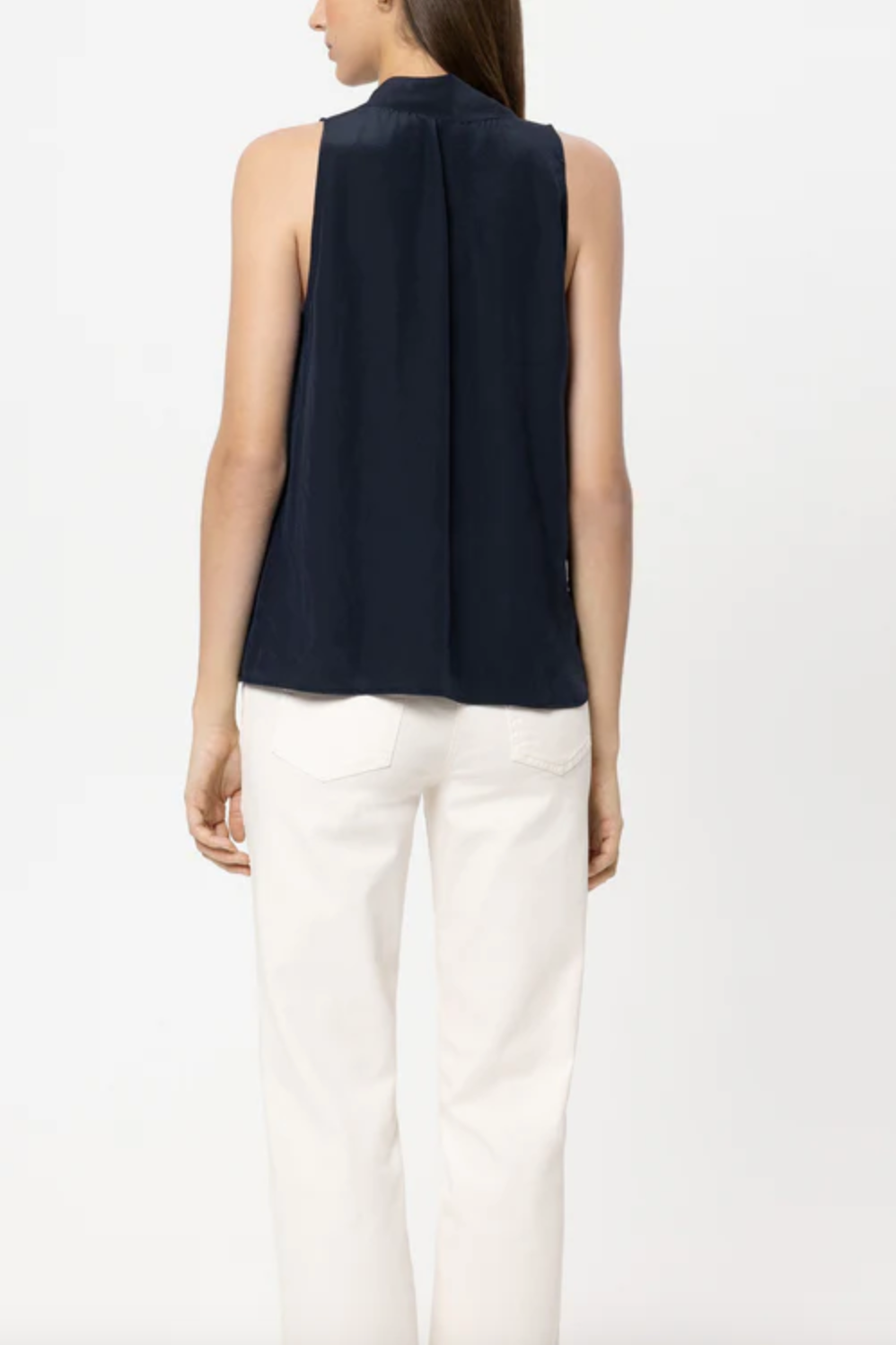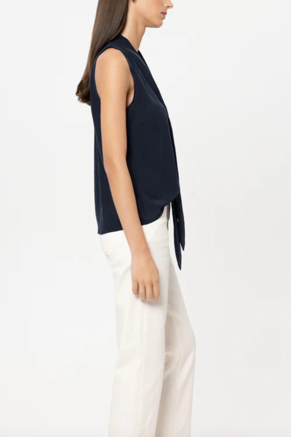 Flared blouse top made from techno silk with an American shoulder and a decorative flap. The V-neckline is trimmed with an elegant lace border.