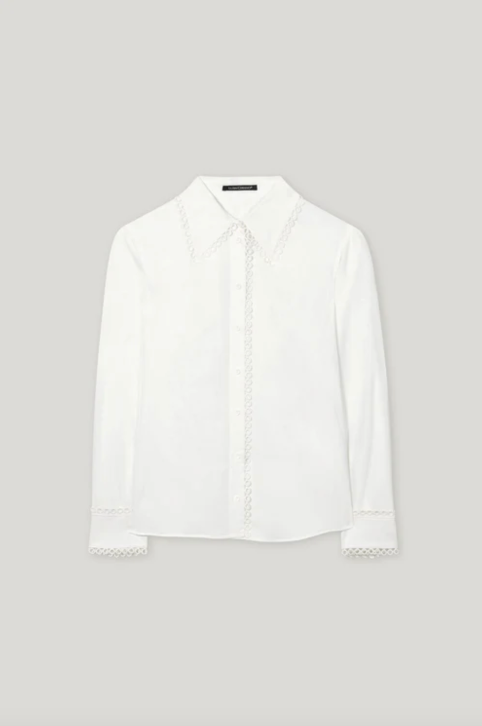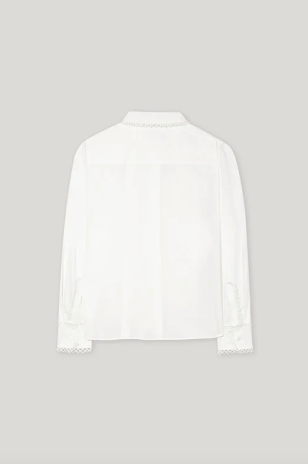 Shirt blouse made from fine cotton voile in a casual silhouette. The blouse is decorated with a minimalist lace trim on the collar, button placket and sleeve cuffs.